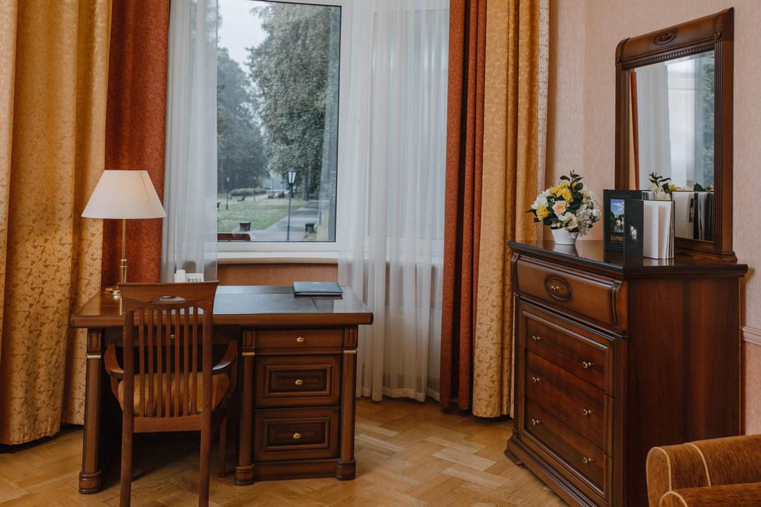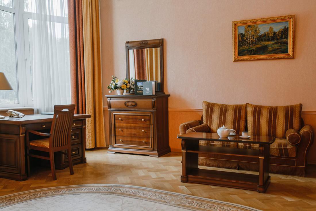 Джуниор сюит оснащен мебелью в классическом стиле, здесь проводится ежедневная уборка и смена полотенец. В интерьере использованы натуральные материалы.