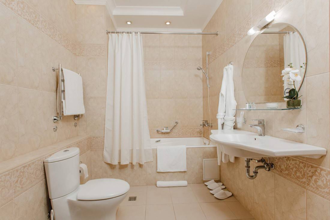Санузел имеет полы с подогревом, оснащен душем или ванной.